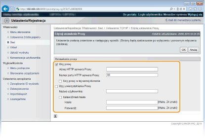 Aby ustawić lub zmienić hasło dla uwierzytelnienia proxy, gdy funkcja ta jest włączona, zaznacz pole wyboru i wprowadź nowe hasło składające się ze znaków alfanumerycznych w polu tekstowym [Hasło]. W celu potwierdzenia należy wprowadzić to samo hasło w polu tekstowym [Potwierdź].