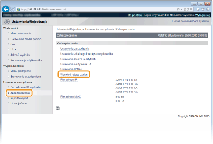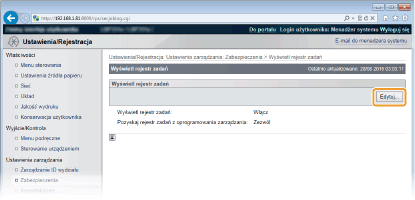 Gdy to pole wyboru jest zaznaczone, można użyć oprogramowania do zarządzania urządzeniami, takiego jak iW Management Console, aby uzyskać historię drukowania zadań. Aby wyłączyć uzyskiwanie historii drukowania zadań przez oprogramowanie do zarządzania, należy usunąć zaznaczenie tego pola. Gdy pole wyboru [Wyświetl rejestr zadań] jest zaznaczone, funkcja ta jest automatycznie włączana.