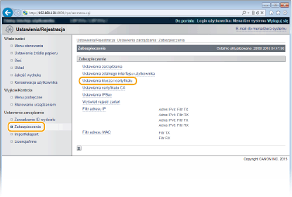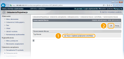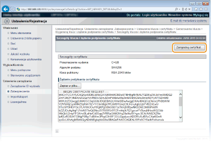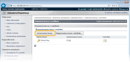 Parę kluczy można wygenerować za pomocą urządzenia, jeżeli wymaga tego komunikacja szyfrowana z użyciem protokołu TLS (Transport Layer Security). Z protokołu TLS można korzystać podczas udzielania dostępu do urządzenia przez zdalny interfejs użytkownika lub drukowania IPP. Można zarejestrować maksymalnie osiem par kluczy, w tym kluczy zainstalowanych fabrycznie. Wraz z parami kluczy wygenerowanymi dla łączności sieciowej używane są certyfikaty z podpisem własnym. Wraz z kluczem i żądaniem podpisania certyfikatu (CSR) można wysłać wniosek o certyfikat cyfrowy CA dla pary kluczy wygenerowanej przez urządzenie.