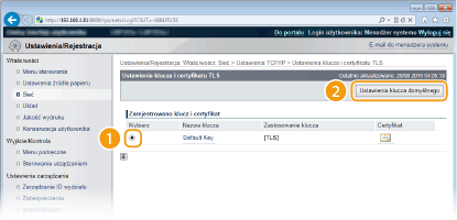 Gdy włączono protokół TLS za pomocą opcji [Ustawienia zdalnego interfejsu użytkownika] lub [Ustawienia wydruku IPP], opcja [Ustawienia klucza domyślnego] nie wyświetla się. Aby zmienić używany klucz, przejdź do punktu 6 i usuń zaznaczenie pól wyboru [Użyj TLS] w odpowiednio sekcji [Ustawienia zdalnego interfejsu użytkownika] lub [Ustawienia wydruku IPP].
