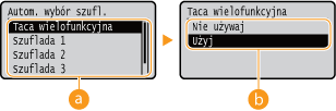 W przypadku wybrania dla opcji <Wielof. dla miesz.> ustawienia <Włącz> pierwszeństwo ma papier podawany z szuflady na papier, nawet jeśli ustawienie opcji <Priorytet tacy wiel.> to <Włącz>.