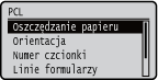 Wszystkie ustawienia z listy dotyczące poleceń sterowania PCL są opatrzone krótkim opisem. Ustawienia domyślne oznaczone są przy pomocy znaku (