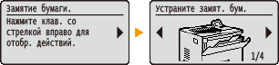 В некоторых случаях при возникновении ошибки отображаются указания по ее устранению. Следуйте указаниям на экране для решения проблемы. Экран отображается при возникновении замятия бумаги, как показано на приведенном ниже примере. Дополнительные сведения об отображаемых сообщениях см. в разделе "Устранение неполадок (FAQ)" на веб-сайте интернет-руководств.