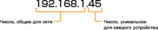 IP-адрес состоит из четырех чисел, разделенных точками (.) (например, 192.168.1.45). Каждое число должно лежать в диапазоне от 0 до 255. Обычно первые три числа должны совпадать с числами для маршрутизатора, поскольку они являются общими для сети. Определите последнее число (например, 45 в 192.168.1.45) так, чтобы оно отличалось от чисел для других устройств.
