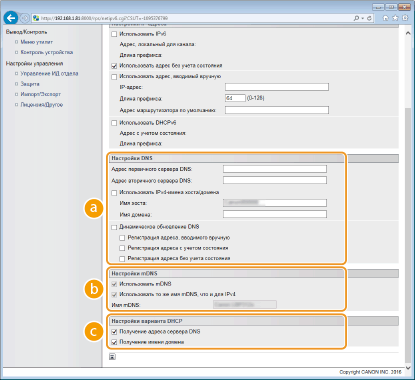 2 | Настройте параметры DNS IPv6. Необходимо установить флажок [Использовать IPv6], чтобы выполнить настройку параметров. Настройка адресов IPv6 ![]() [Настройки DNS][Адрес первичного сервера DNS] Введите IP-адрес сервера DNS. Невозможно ввести адрес, начинающийся с символов "ff" (или адрес многоадресной рассылки), адрес "0000::0000" (все нули), а также адрес, начинающийся с "0:0:0:0:0:ffff" или "0:0:0:0:0:0". [Адрес вторичного сервера DNS] Введите IP-адрес альтернативного сервера DNS (при наличии). Невозможно ввести адрес, начинающийся с символов "ff" (или адрес многоадресной рассылки), адрес "0000::0000" (все нули), а также адрес, начинающийся с "0:0:0:0:0:ffff" или "0:0:0:0:0:0". [Использовать IPv4-имена хоста/домена] Установите этот флажок для использования того же имени узла и доменного имени, что и в IPv4. [Имя хоста] Введите имя узла аппарата (цифры и буквы), которое будет зарегистрировано для DNS-сервера. [Имя домена] Введите имя домена (буквы и цифры), к которому принадлежит устройство (например, "example.com"). [Динамическое обновление DNS] Установите флажок для динамического обновления записей DNS при каждом изменении IP-адреса аппарата. Чтобы задать типы адресов, которые необходимо зарегистрировать для DNS-сервера, установите этот флажок для [Регистрация адреса, вводимого вручную], [Регистрация адреса с учетом состояния] или [Регистрация адреса без учета состояния]. [Настройки mDNS][Использовать mDNS] Используемый Bonjour, протокол mDNS (многоадресный DNS) представляет собой протокол, связывающий имя узла с IP-адресом без использования DNS. Чтобы включить mDNS, установите этот флажок. Этот флажок можно установить только в том случае, если установлен флажок [Использовать IPv6]. [Использовать то же имя mDNS, что и для IPv4] Установите этот флажок для использования того же имени mDNS, что и заданное в IPv4. Чтобы задать другое имя, снимите флажок и введите имя mDNS в текстовом поле [Имя mDNS]. [Настройки варианта DHCP][Получение адреса сервера DNS] Установите этот флажок, чтобы включить параметр 23 для получения адреса DNS-сервера от сервера DHCP. [Получение имени домена] Установите этот флажок, чтобы включить параметр 24 для получения имени домена от сервера DHCP. |