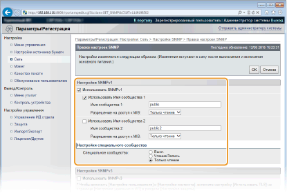 Специальное сообщество представляет собой предварительно настроенное сообщество, ориентированное исключительно на администраторов, использующих программное обеспечение Canon (например, iW Management Console). Выберите значение [Выкл.], [Чтение/Запись] или [Только чтение] для полномочий доступа к объектам MIB.