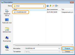 4 | Укажите папку, в которой находятся дополнительные драйверы, выберите файл INF, затем нажмите [Открыть]. ![]() Выберите папку, как показано ниже, в соответствии с операционной системой сервера печати. Если на сервере печати установлена 32-разрядная операционная система Выберите папку [UFR II]-ваш язык-[x64]-[Driver] на диске User Software CD-ROM/DVD-ROM. Если на сервере печати установлена 64-разрядная операционная система Выберите папку [UFR II]-ваш язык-[32BIT]-[Driver] на диске User Software CD-ROM/DVD-ROM. | ||||||