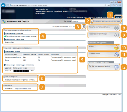 Отображение текущего состояния и информации об ошибках аппарата. Если возникает ошибка, отображается ссылка на страницу сведений об ошибке.