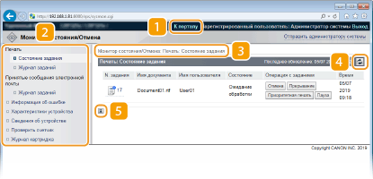 Отображает страницу [Монитор состояния/Отмена]. На этой странице можно проверить текущее состояние печати, отменить обработку печати и посмотреть журнал заданий печати.