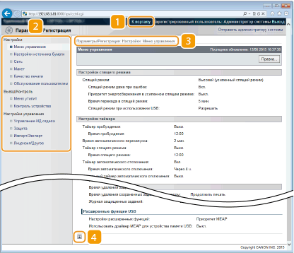 Показывает страницу [Параметры/Регистрация]. При выполнении входа в систему в режиме управления можно изменять параметры и сохранять/загружать зарегистрированные данные.
