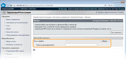 Загрузите (импортируйте) данные, экспортированные из аппарата. Можно также импортировать настройки с другого аппарата, если он той же модели, что и ваш аппарат.