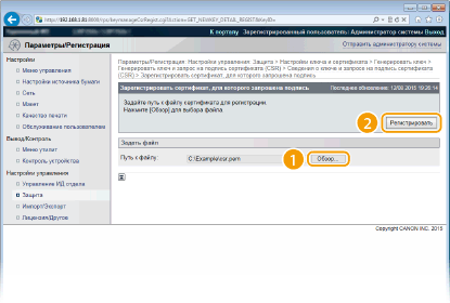 Нажмите [Обзор] в разделе [Путь к файлу], укажите файл для запроса на подпись сертификата, затем нажмите [Регистрировать].
