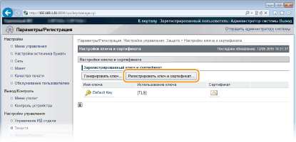 Щелкните [Настройки ключа и сертификата] для установки пары ключей или [Настройки сертификата от CA] для установки сертификата CA.