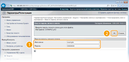 2 | Введите название пары ключей и пароль, затем нажмите [OK]. [Имя ключа] Введите алфавитно-цифровые символы имени пары ключей, которую требуется зарегистрировать. [Пароль] Введите алфавитно-цифровые символы для пароля закрытого ключа, заданного для регистрируемого файла. |