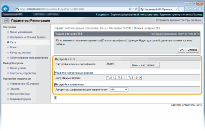 Можно включить шифрование данных, передаваемых между аппаратом и веб-браузером компьютера, а также данных печати IPP для печати по Интернету, используя протокол TLS (Transport Layer Security, безопасность транспортного уровня). Протокол TLS — это механизм шифрования данных, передаваемых и получаемых по сети. Протокол TLS должен быть включен, если Удаленный ИП используется для задания параметров IPSec (метод предварительного ключа), аутентификации IEEE 802.1X (TTLS/PEAP) или SNMPv3. Для использования шифрованной связи TLS необходимо задать пару ключей и включить функцию TLS. Подготовьте пару ключей для использования (Настройка параметров для пар ключей и цифровых сертификатов).