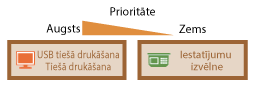 Kad veicat USB tiešo drukāšanu (USB Direct Print) vai tiešo drukāšanu (Direct Print), drukāšanai norādītie vai TIFF datiem saglabātie iestatījumi aizstās darbības panelī norādītos iestatījumus.