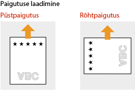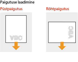 Selles jaotises kirjeldatakse põhiliselt eelprinditud paberi sisestamist õiget pidi ja õige paigutusega. Paberisahtlisse või universaalalusele paberi asetamise üldised juhised on esitatud allpool. |