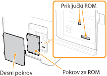V tem poglavju je opisano, kako namestite Komplet za tiskanje črtne kode ali Nabor mednarodnih pisav PCL v napravo. ROM je priključen s konektorji ROM znotraj desnega pokrova naprave.