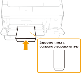 Преди да заредите пликове или пощенски картички, подгответе хартията, като изгладите всякакви нагъвания по нея. Също така обърнете внимание на ориентацията на пликовете или пощенските картички и коя страна е обърната нагоре. Обърнете внимание, че не можете да зареждате нито пликове, нито пощенски картички в касетата за хартия.