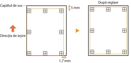 După ce confirmaţi direcţia şi distanţa de reglare, specificaţi o poziţie de imprimare reglată. Puteţi regla poziţia de imprimare în intervalul -5,0 mm – +5,0 mm în etape crescătoare de 0,1 mm în fiecare direcţie: pe verticală şi pe orizontală.