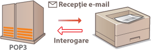Imprimarea unui e-mail vă permite să imprimaţi mesajele şi fişierele de imagine ataşate ale unui e-mail primit de la serverul de mail POP3 fără a utiliza un computer. E-mailurile pot fi primite şi manual, şi automat la intervale regulate. Când se utilizează protocolul SMTP, e-mailurile trimise direct către aparat prin intermediul unui server de mail nu sunt imprimate.