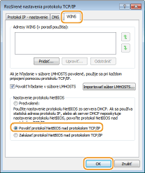 Kliknite na kartu [WINS], vyberte položku [Povoliť protokol NetBIOS nad protokolom TCP/IP] a potom kliknite na položku [OK].