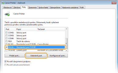 Nemôžete vymazať port, ktorý je aktuálne konfigurovaný ako port tlačiarne. Ak chcete vymazať tento port, vyberte iný port a kliknite na položku [Použiť], čím sa konfiguruje ako nový port tlačiarne a potom vymažte pôvodný port.