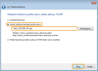 Ak chcete použiť IPP, zadajte „http://<IP adresa zariadenia>/ipp“ pre cieľ pripojenia.