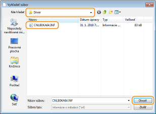 Zadajte priečinok, v ktorom sú ovládače tlačiarne, vyberte INF súbor a potom kliknite na položku [Otvoriť].