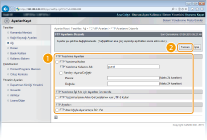 FTP istemcisi aracılığıyla makine ayar değişikliği yapılmasına izin vermek için onay kutusunu seçin. Ayar değişikliklerine izin verilmediği takdirde, onay kutusunun işaretini kaldırın.