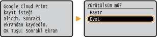 Makineye mobil bir cihaz ya da Google Chrome vasıtasıyla da kayıt olabilirsiniz. Makine ekranı, kaydın tamamlanmasından önce aşağıdaki onay ekranını gösterir. Kaydı tamamlamak için şu işlemleri yapın:   <Evet>   .