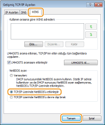 [WINS] sekmesine tıklayın, [TCP/IP üzerinde NetBIOS'u etkinleştir] öğesini seçin ve ardından [Tamam] öğesine tıklayın.