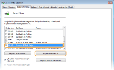 Yazıcı bağlantı noktası olarak yapılandırılmış bir bağlantı noktasını silemezsiniz. Bu bağlantı noktasını silmek için başka bir bağlantı noktası seçin ve [Uygula] öğesine tıklayarak onu yeni yazıcı bağlantı noktası olarak yapılandırın ve ardından orijinal bağlantı noktasını silin.