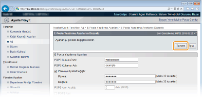 Posta sunucusuna otomatik olarak bağlanmak için zaman aralığını dakika olarak belirtin. Posta sunucusunun posta kutusundaki yeni e-postalar, belirtilen zaman aralıklarında otomatik olarak alınır ve yazdırılır. Bu ayarları ayrıca, işletim panelinin ayarlar menüsü içinde <POP3 Alım Aralığı> öğesini kullanarak da belirtebilirsiniz (