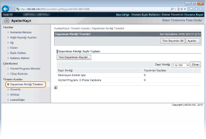 [Kullanıcı Yönetimi] içinde [Departman Kimliği Yönetimi] öğesini seçin ve ardından aşağıda yer alan [Ayarlar] öğesine tıklayın.