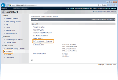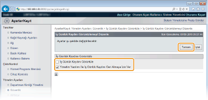 Onay kutusunu seçerseniz, iW Management Console gibi bir cihaz yönetim yazılımı kullanılarak yazdırma işi geçmişi alınabilir. Yazdırma işi geçmişini elde etmek için yönetim yazılımını devre dışı bırakmak üzere onay kutusunun işaretini kaldırın. [İş Günlük Kaydını Görüntüle] onay kutusu seçiliyken bu işlev otomatik olarak etkindir.