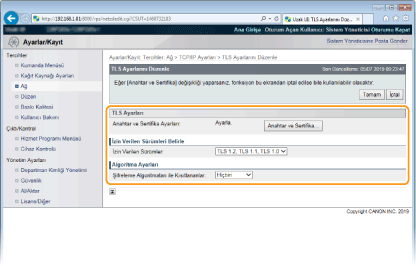 [Uzak UI Ayarları] veya [IPP Baskı Ayarları] tarafından TLS zaten etkinleştirilmişse, [Varsayılan Anahtar Ayarları] görüntülenmez. Kullanılacak anahtarı değiştirmek için 6. adıma göz atın ve sırasıyla [Uzak UI Ayarları] veya [IPP Baskı Ayarları] altında [TLS Kullan] onay kutularının işaretini kaldırın.