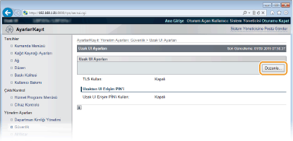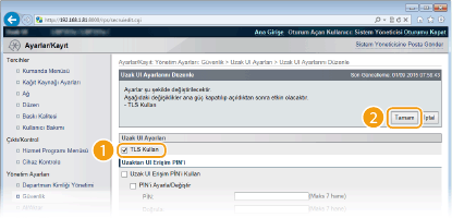 TLS şifreli iletişim ayarlarını ayrıca, işletim panelinin ayar menüsünden de etkinleştirebilir veya devre dışı bırakabilirsiniz. Uzak UI Ayarları