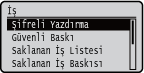 ( ) öğesine bastığınızda, İş menüsü görüntülenir. Aşağıda açıklanmış ayarları, makine çevrimdışı iken belirtebilirsiniz. |