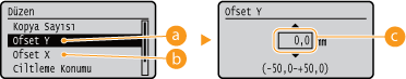 Her bir kağıt kaynağı için yazdırma konumunu ayrıntılı olarak belirtmek için, <Kullanıcı Bakımı> altındaki <Baskı Knmnu Ayarla> öğesini seçebilirsiniz. Kullanılabilen dengeleme değerleri için aralık başlangıcı -5,0 mm - +5,0 mm olarak tanımlanmıştır. Yazdırma Konumunun Ayarlanması