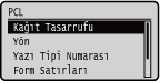 PCL kontrol komutları ile ilgili tüm ayarlar, kısa açıklamalarla birlikte listelenir. Varsayılan ayarlar kama sembolü (