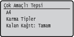 Belirtilmiş geçerli kağıt boyutunu ve kağıt türünü ve her bir kağıt kaynağı için kalan mevcut kağıt seviyesini görüntülemek için seçin.