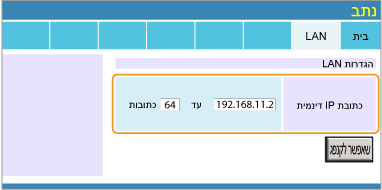 כתובת ה-IPv4 של מכשיר יכולה להיות מוקצית אוטומטית על-ידי פרוטוקול הפקת כתובות IP דינמי, כגון DHCP, או מוזנת ידנית. בעת חיבור המכשיר ל-LAN קווי, ודא שהמחברים של כבל ה-LAN הוכנסו היטב ליציאות (חיבור ל-LAN קווי).