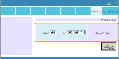يمكن تعيين عنوان IPv4 للجهاز تلقائيًا عن طريق بروتوكول عنوان IP، مثل DHCP، أو يتم إدخاله يدويًا. عند توصيل الجهاز بشبكة محلية سلكية، فتأكد من إدخال موصلات كابل الشبكة المحلية في المنافذ بإحكام (التوصيل بشبكة LAN سلكية).