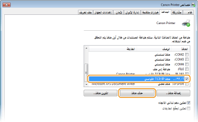لا يمكنك حذف منفذ تم تكوينه حاليًا كمنفذ الطابعة. لحذف هذا المنفذ، حدد منفذًا مختلفًا وانقر فوق [تطبيق] لتكوينه كمنفذ الطابعة الجديد، ثم احذف المنفذ الأصلي.