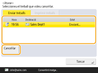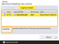 al tauler de control mentre s'està processant un treball d'enviament o impressió i es mostra una pantalla que porta a <Enviar treballs>/<Imprimir treballs>, s'atura el treball d'enviament o impressió en curs i apareix <Enviar treballs>/<Imprimir treballs>.