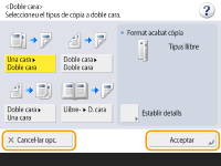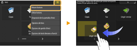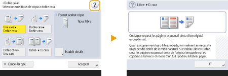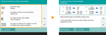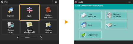 Vegeu la guia de funcionsPremeu <Ajuda> per visualitzar una pantalla que us ensenya què podeu fer amb les funcions de l'equip i també consells per utilitzar les funcions de còpia, lectura, etc. Vegeu aquesta pantalla quan vulgueu obtenir més informació sobre quines funcions estan disponibles i com utilitzar-les. ![]() Exemple: Tutorial de les funcions de còpia Quan seleccioneu un element de la llista, apareix la pantalla de tutorial. ![]() Utilitzeu la funció d'ajudaSegons les funcions que s'estiguin visualitzant, de vegades apareixerà a la part superior dreta de la pantalla. Premeu per comprovar la descripció i el mètode d'operació de la funció.![]() Premeu <Fi> per tornar a la pantalla anterior. Actueu de la mateixa manera que amb un telèfon intel·ligent (desplaçar ràpidament/arrossegar i deixar anar)En algunes pantalles, podeu canviar de pàgina o desplaçar-vos passant el dit cap amunt/avall o cap a la dreta/esquerra a la pantalla de la mateixa manera que ho faríeu amb un smartphone. ![]() ![]() També podeu desactivar les operacions de desplaçar. <Usar funció de pinçar> Les operacions de desplaçar i d'arrossegar i deixar anar no es poden utilitzar si heu posat <Invertir colors de la pantalla> en <On>. <Invertir colors de la pantalla> A pantalles amb botons mòbils, es poden arrossegar i deixar anar els botons per moure'ls. ![]() |