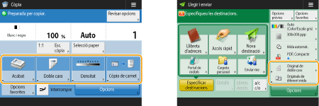 Podeu canviar els botons d'opcions que apareixen a les pantalles de funcions bàsiques (de còpia, fax i lectura). També podeu mostrar una pantalla de funcions bàsiques diferent que estigui personalitzada per a cada usuari que ha iniciat la sessió.