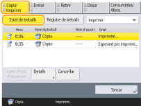 Si premeu al tauler de control quan els treballs de còpia estan en espera, tots els treballs de còpia queden en pausa i apareixen el missatge <<Aturar>Seleccioneu el treball de còpia que voleu cancel·lar.> i la llista de treballs de còpia. Podeu seleccionar un treball de còpia de la llista i cancel·lar el treball prement <Cancel·lar>. Si voleu reprendre la còpia, premeu <Reprendre còpia>. |