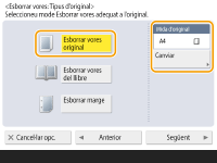 1 | Premeu <Esborrar vores original> i establiu la <Mida d'original>. ![]() Si la mida que apareix a <Mida d'original> és diferent de la mida de l'original establert, premeu <Canviar> per seleccionar la mida. |